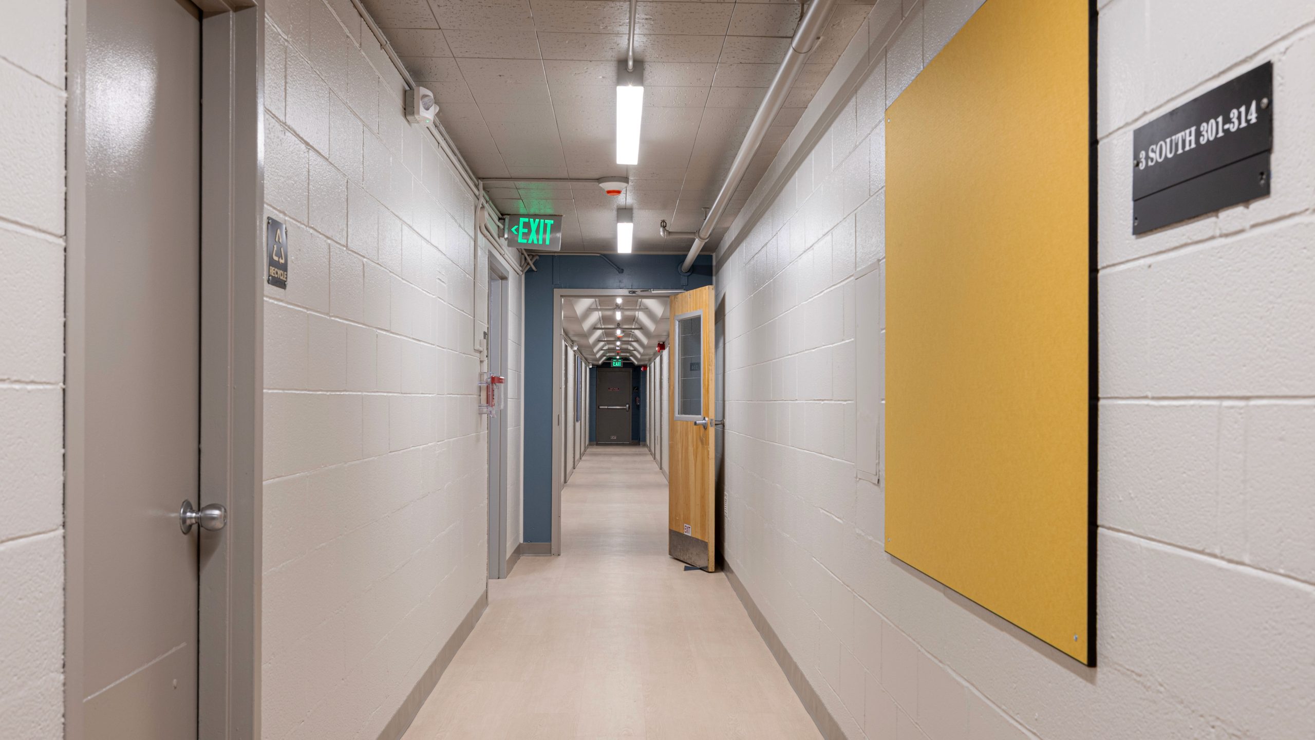 Phase 2 of the plan was implemented in the summer of 2024 at Ryan Hall. The scope of work included updating finishes in the student bedrooms and hallways - new lighting, doors, luxury vinyl flooring, and clean modern paint selections - as well as fire alarm and building exhaust systems.